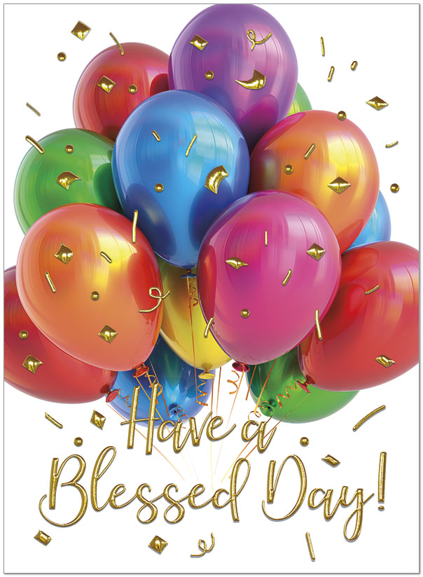 Wish them a blessed birthday with this colorful balloon design featuring gold foil embossing. Printed on satin FSC® paper.