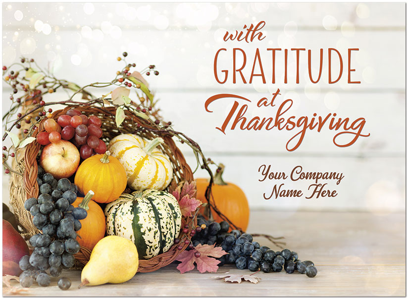 Show gratitude with this card featuring a Thanksgiving bounty and your company name on the front of the card. Printed on matte FSC® paper.