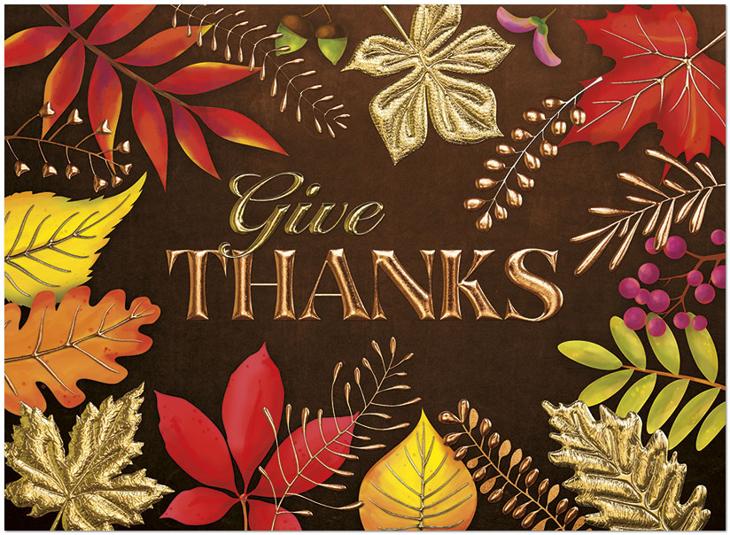 Designed to impress, this elegant Thanksgiving card features copper and gold holographic foil embossing on satin FSC® paper.