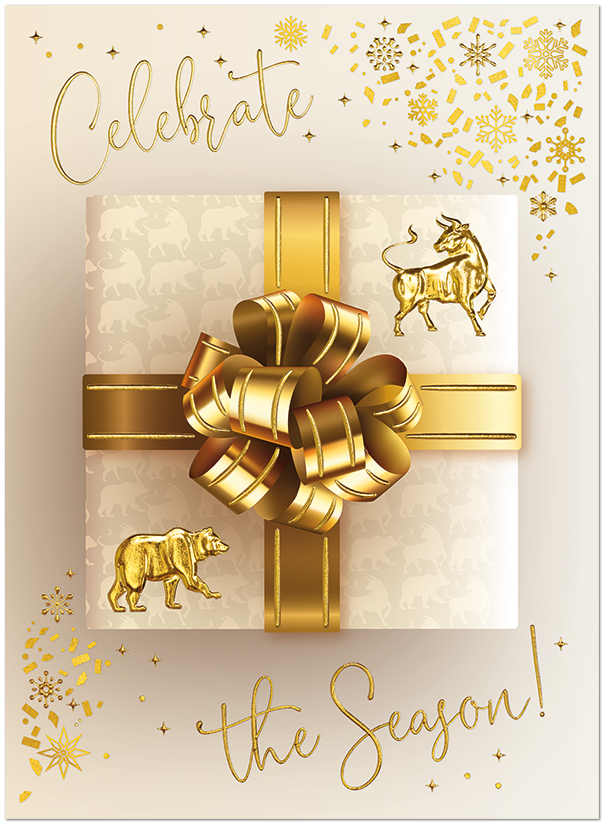 Celebrate the season with this bull and bear gift design featuring gold foil embossing.
