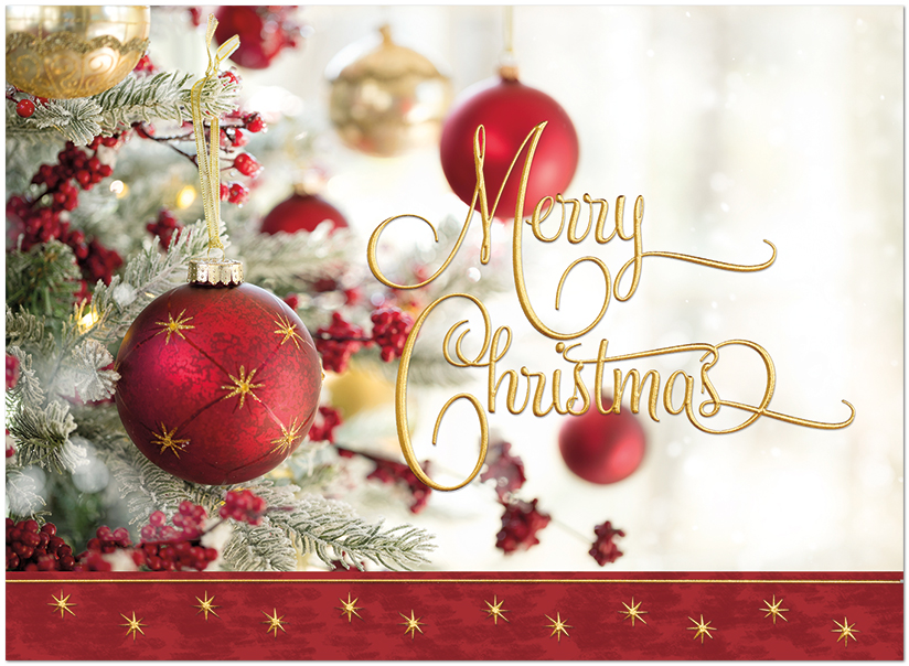 A classic Christmas card featuring a red and gold ornament design with gold foil embossing. Printed on matte FSC® paper.