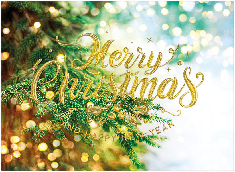 Send Christmas wishes to clients and employees with this Christmas tree design featuring gold foil embossing. Printed on satin FSC® paper.