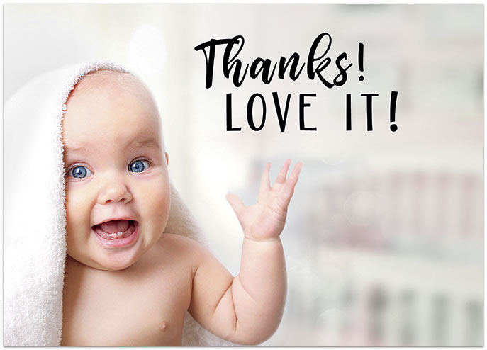 A custom notecard featuring a smiling baby and your own sentiment on the front. Printed on satin FSC® paper.