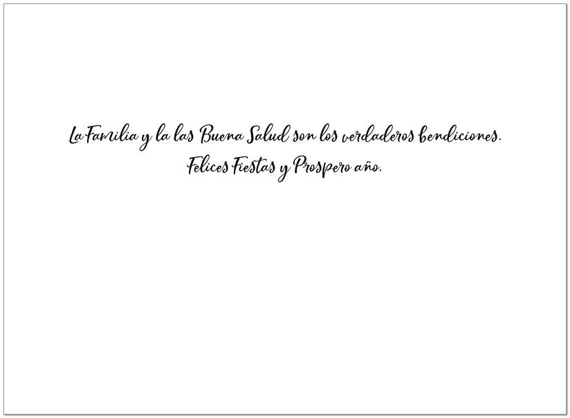 Interior Text: La Familia y la las Buena Salud son los verdaderos bendiciones. Feliz Fiestas y Prospero año.