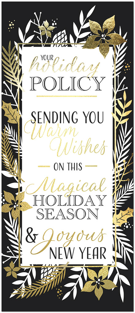 A stunning holiday card for the insurance industry designed to look like an old-fashioned insurance policy. Featuring gold foil stamping on satin FSC® paper. Includes 26 white envelopes for every 25 cards ordered.