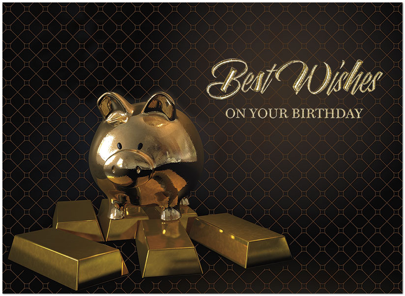 This birthday card features a gold piggy bank with a geometric patterned background and gold foil embossing. Printed on satin FSC® paper.