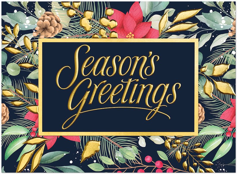 Send holiday wishes with this botanical design featuring gold foil embossing. Printed on satin FSC® paper.