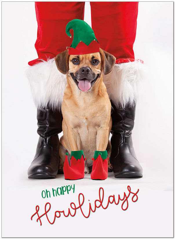 A cute holiday card featuring a puppy dressed as an elf sitting with Santa. Printed on satin FSC® paper.