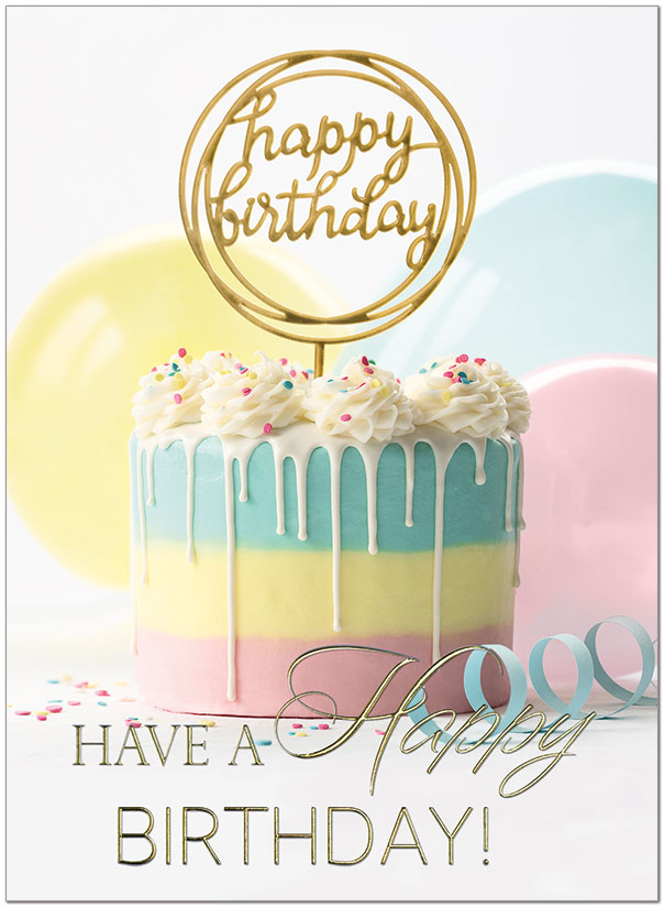 A festive birthday card featuring cake and balloons in pastel colors with gold foil embossing. Printed on matte FSC® paper.