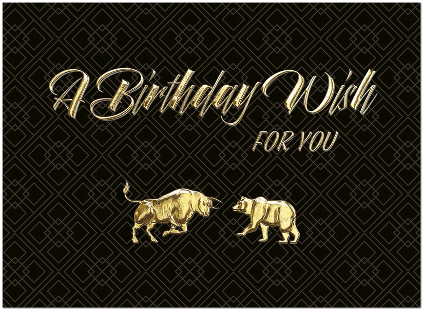 An executive birthday card for the financial industry featuring a bull and bear on a geometric patterned background with gold foil embossing. Printed on satin FSC® paper.