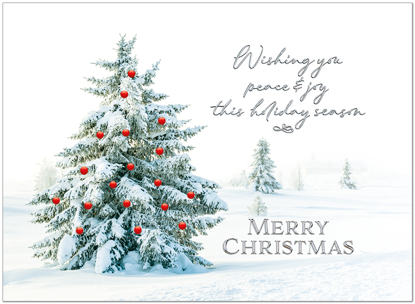 A picturesque snowy tree design featuring silver foil embossing on matte FSC® paper.
