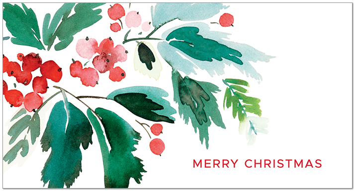 A Christmas card featuring a watercolor holly design printed on satin FSC® paper.