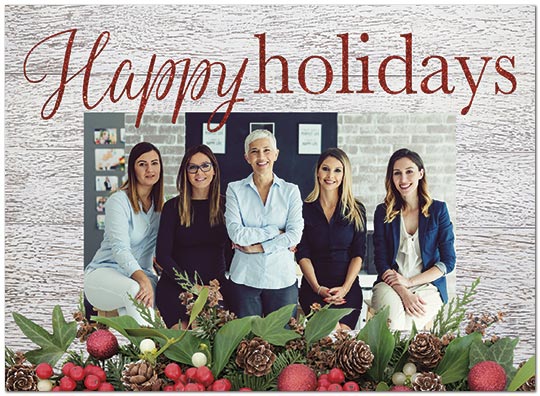A festive holiday card featuring rustic garland and your photo. Printed on satin FSC® paper.