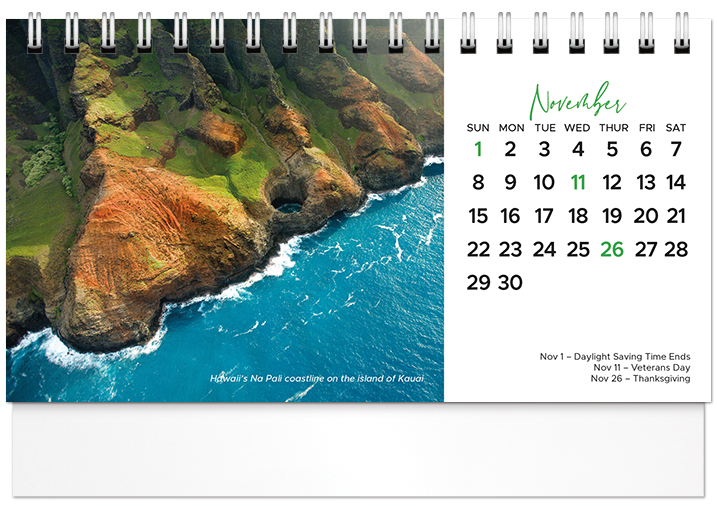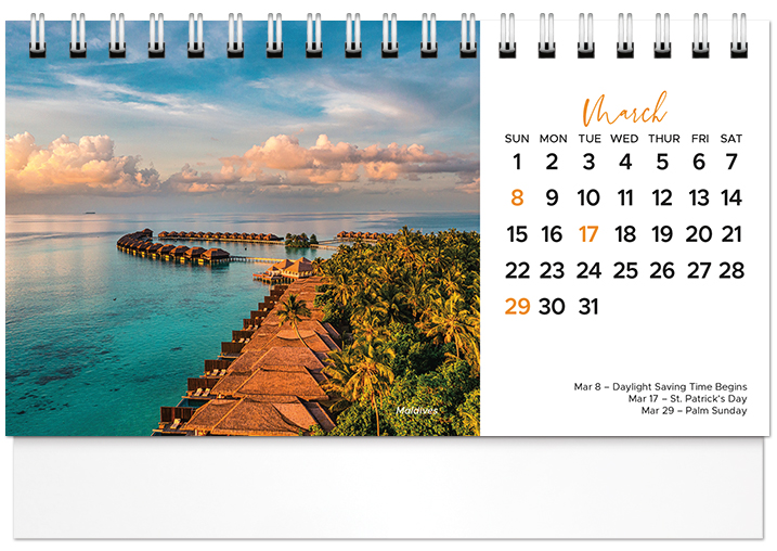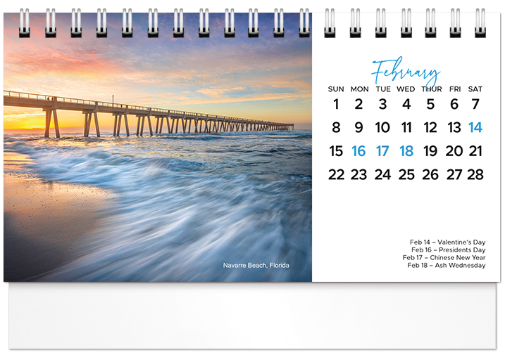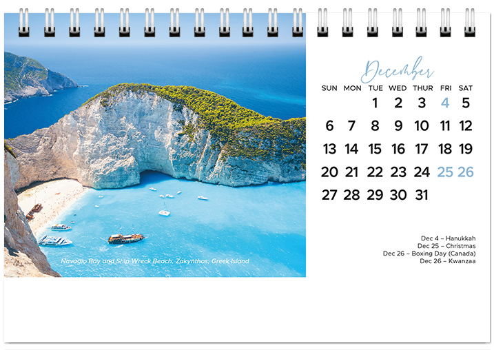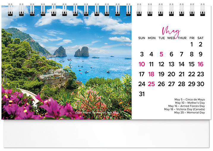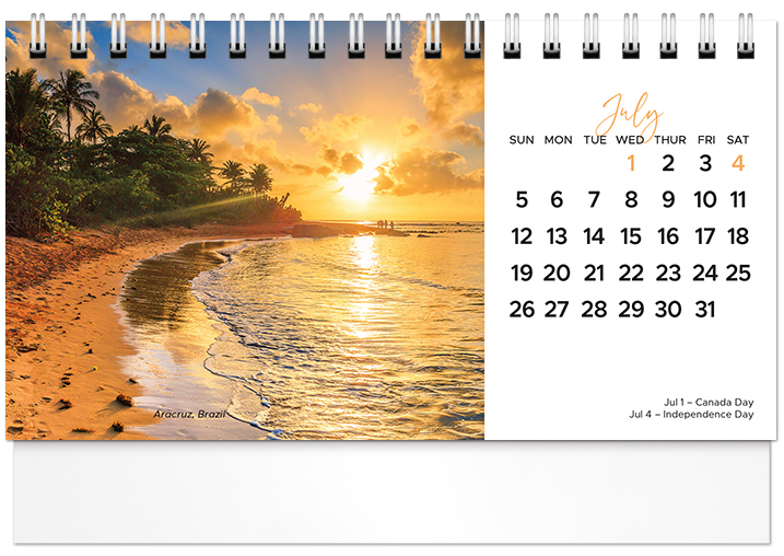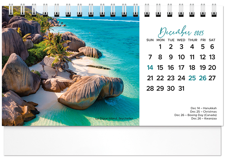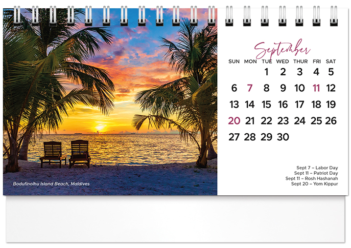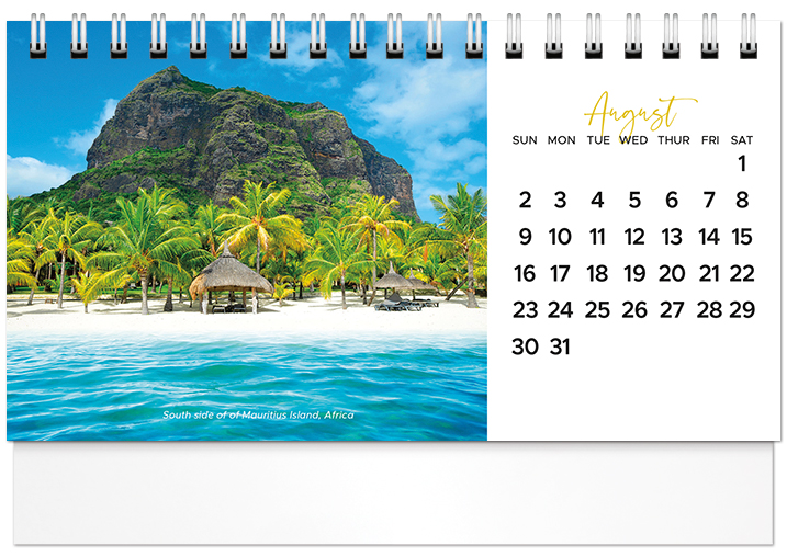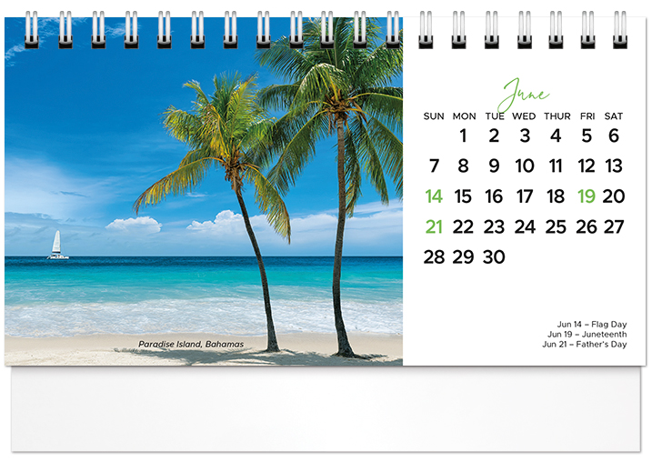 This affordable spiral-bound 2026 tent calendar features beaches from around the globe. The easel design puts the calendar and your imprinted name on your customer's desk all year long. Printed on FSC® paper.