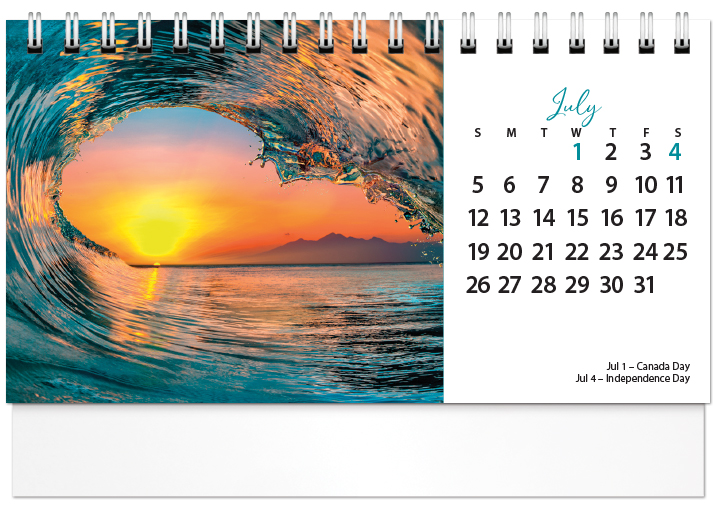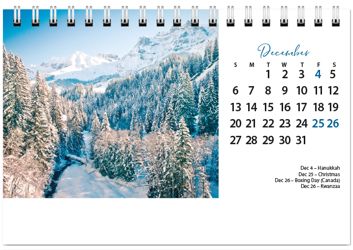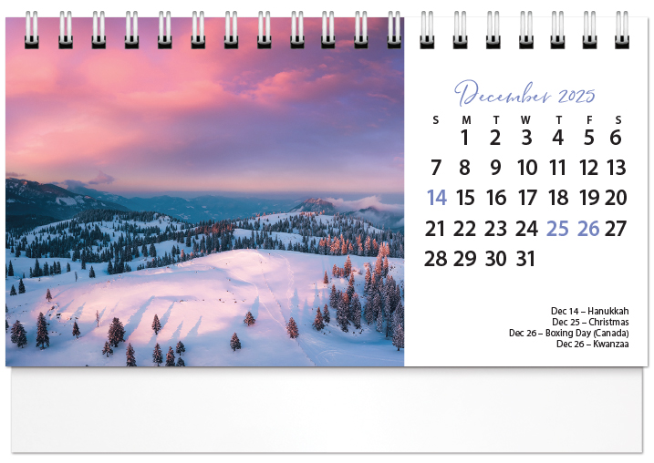 Our Standard Deluxe Desk Calendar stays upright on any flat surface and is made with high quality twin loop binding so pages flip easily. The calendar features 13 months starting with a December 2025 bonus page. The calendar is 13 pages front and back plus the cover. Includes up to 6 lines of FREE imprinting (3 on each side, 30 characters per line). Also includes FREE standard envelopes.
