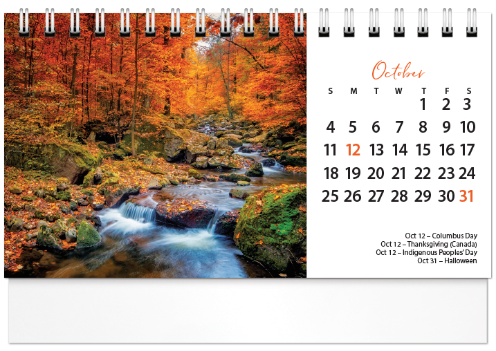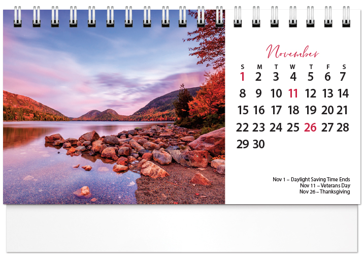Your clients will enjoy the scenic photographs featured month after month in this handy 2026 tent calendar. The easel design puts the calendar and your imprinted name on your customer's desk all year long. Printed on FSC® paper.