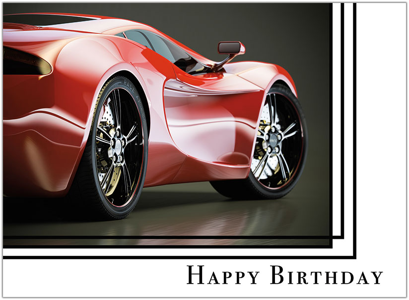 This birthday card features a sleek red sports car against a gray background and is printed on satin FSC® paper.
