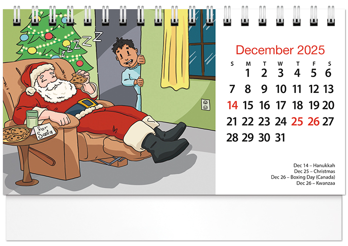 Our Standard Deluxe Desk Calendar stays upright on any flat surface and is made with high quality twin loop binding so pages flip easily. The calendar features 13 months starting with a December 2025 bonus page. The calendar is 13 pages front and back plus the cover. Includes up to 6 lines of FREE imprinting (3 on each side, 30 characters per line). Also includes FREE standard envelopes.