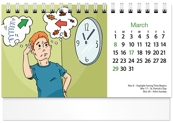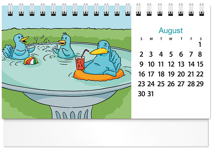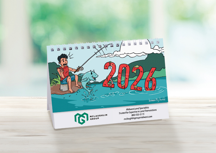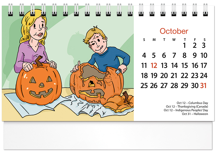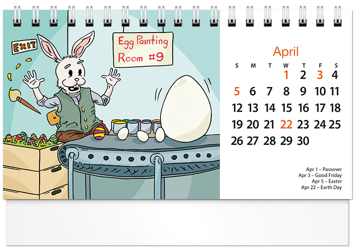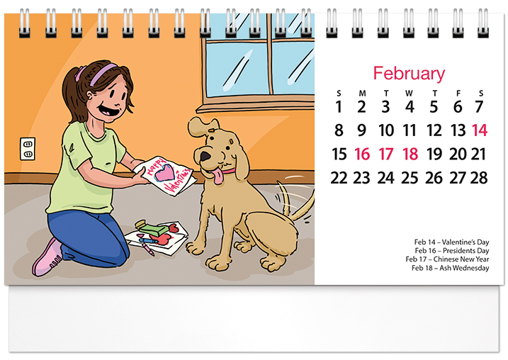 This handy spiral-bound 2026 tent calendar features humorous cartoons drawn by Posty Cards' artist Adam G. The easel design puts the calendar and your imprinted name on your customer's desk all year along. Printed on FSC® paper.