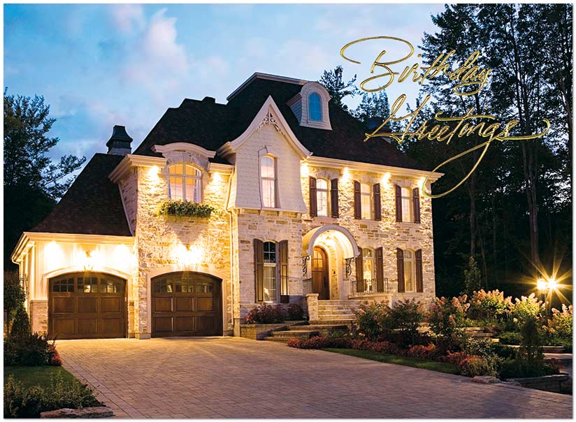 A perfect card for real estate or insurance agents featuring a beautiful home at dusk with gold foil embossing. Printed on satin FSC® paper.