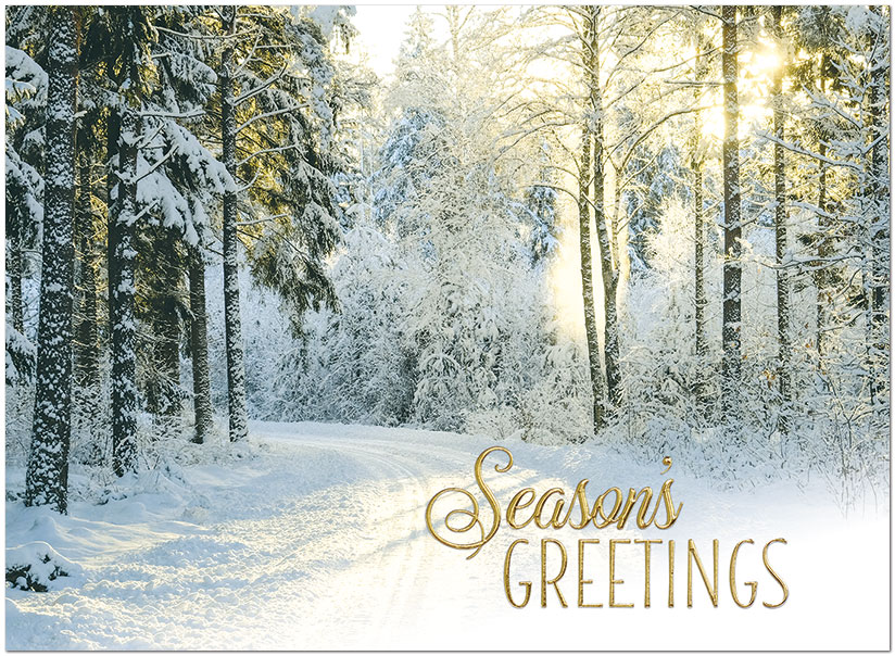 A beautiful holiday card featuring a scenic snowy road and gold foil embossing on satin FSC® paper.